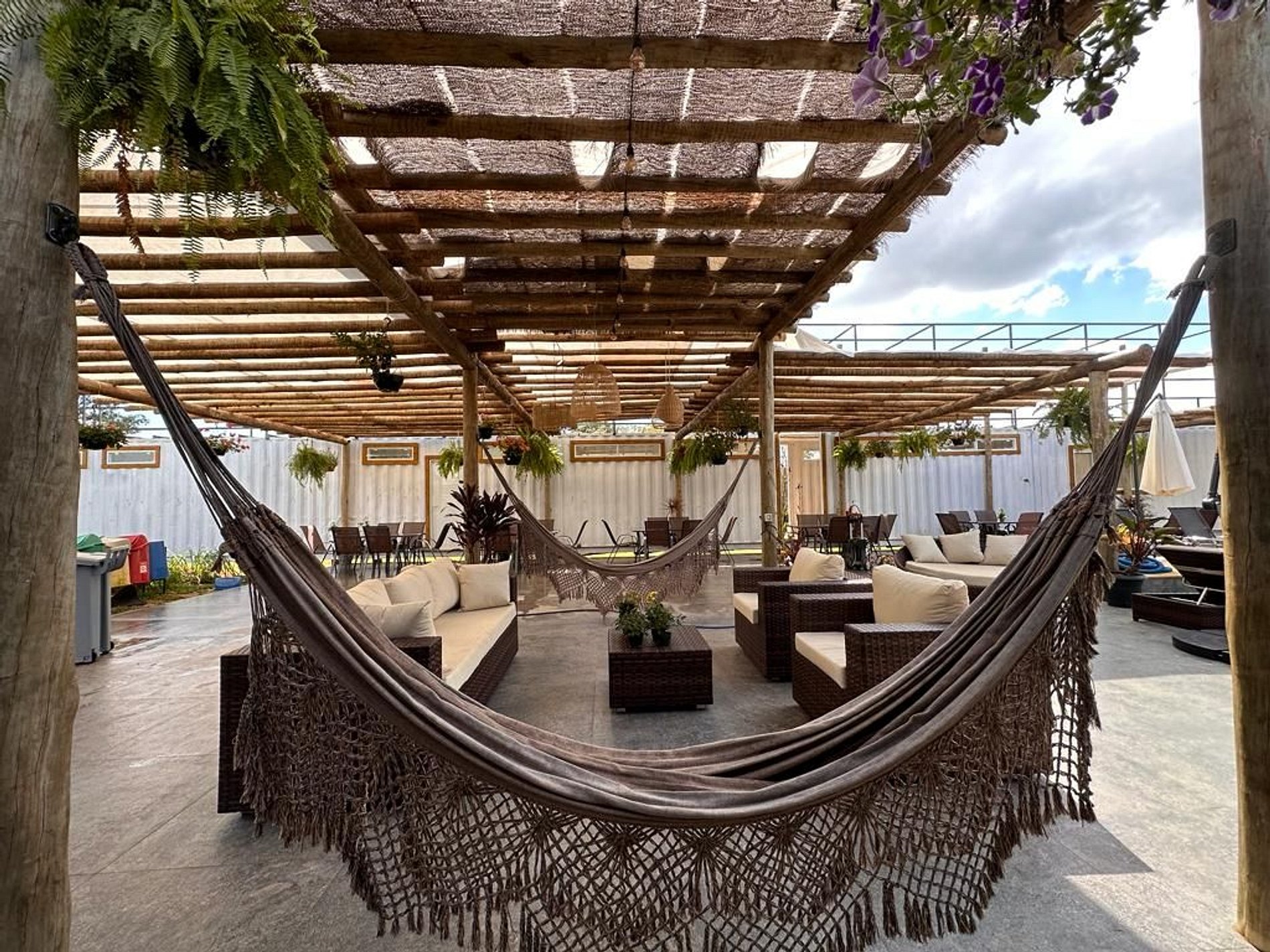 Our guests will be able to enjoy the fauna and flora of the cerrado, in land with 9 thousand square meters, where they will be able to enjoy the swimming pool, prepare meals in the equipped kitchen, have a barbecue, play pool, table tennis, exercise on the trampoline, enjoy the sunset on the rooftop or warm up in the outdoor fireplace at night.