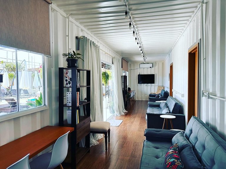It also has a shared room with a desk, bookcase, smart TV, air conditioning, kitchen sink and water filter.