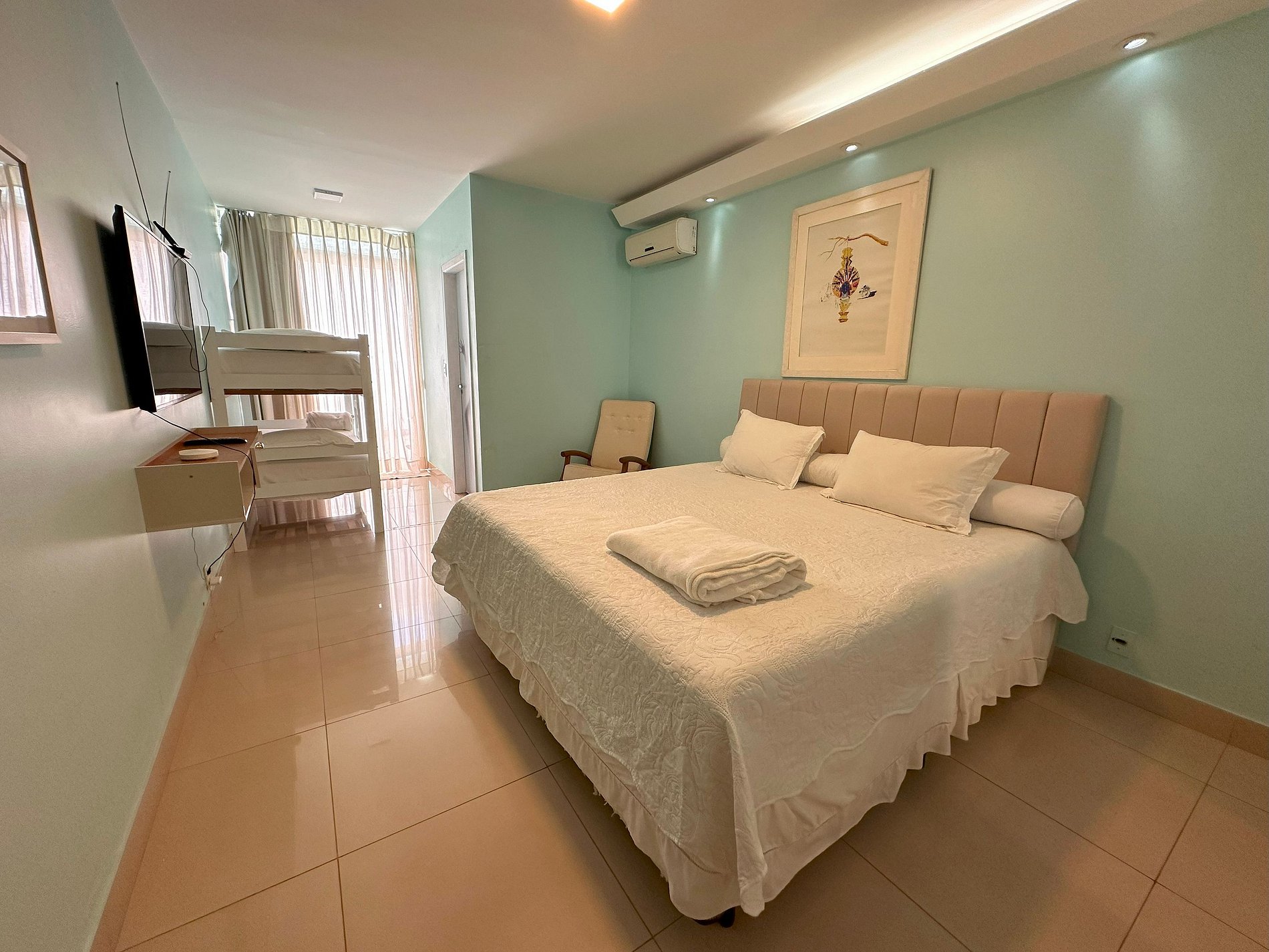Room rental at Casa Modernista. My daughter Sofia's suite accommodates up to 4 people, has air conditioning, smart TV, wifi. The house has 400 m2, 5 suites, and a shared space with a heated pool, SPA for 8 people, gas and charcoal barbecue, 300 mega wifi, hammock, outdoor fireplace, covered lounge, playground and bounce house for the children. It is next to the Gilberto Salomão shopping mall (500m), close to Ponte das Garças (1 km), Pontão do Lago Sul (6 km) and Brasília JK Airport (8 km).