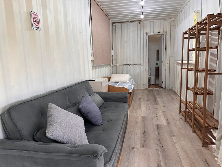 El alojamiento consta de 10 contenedores con cuatro suites y dos amplios dormitorios, dos baños externos, amplia cocina y lavandería externa, con seis baños y tiene capacidad para 34 personas en una cama king, 6 camas dobles, 6 camas individuales y 7 sofás cama.