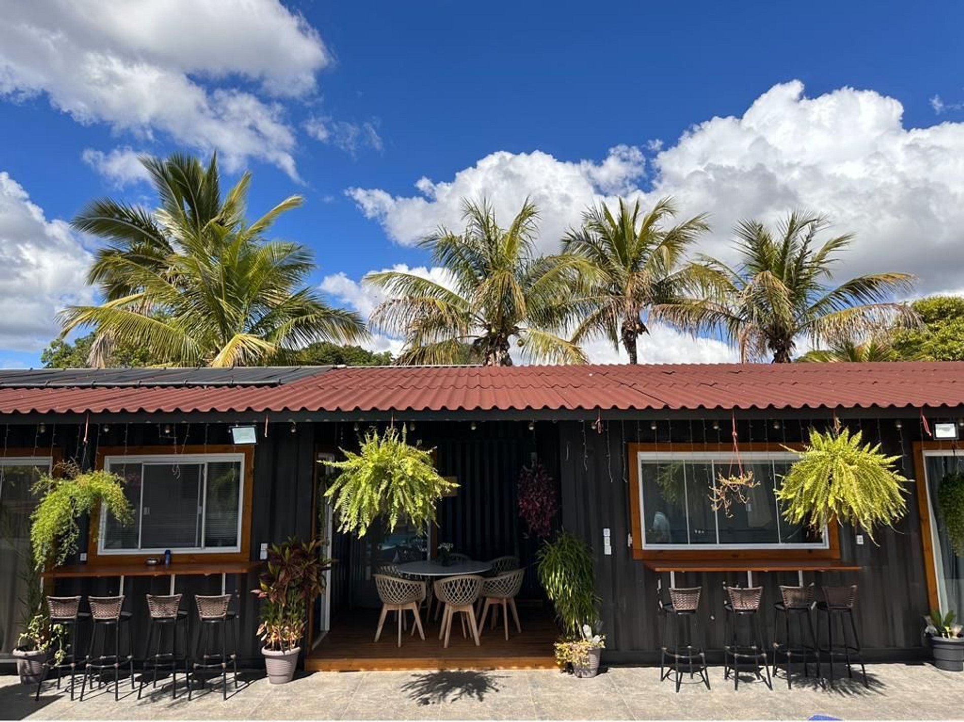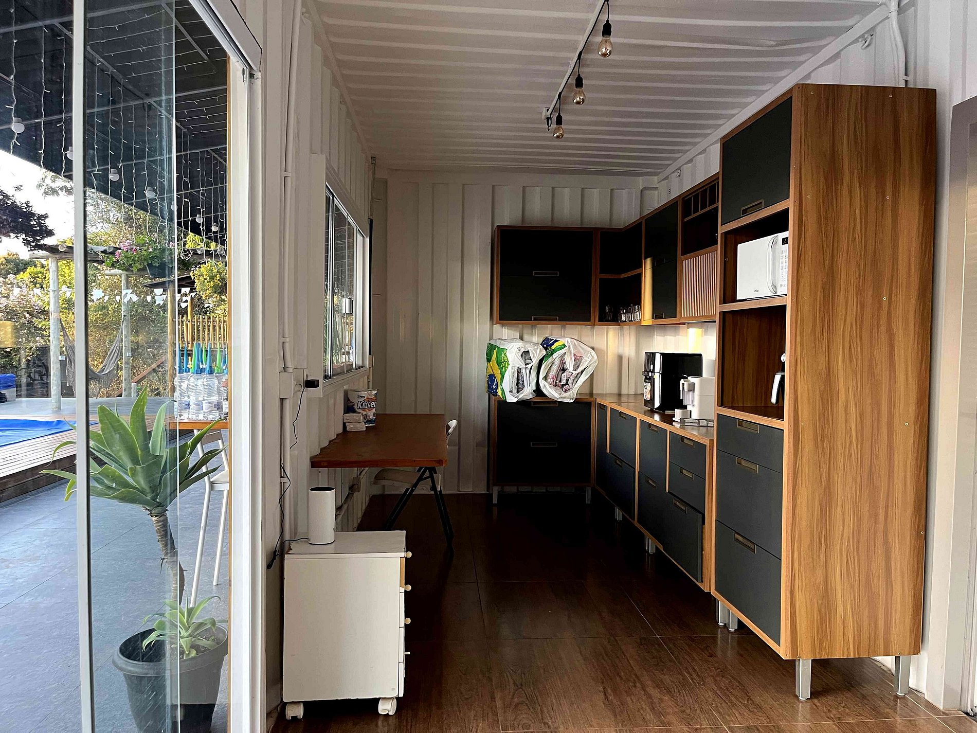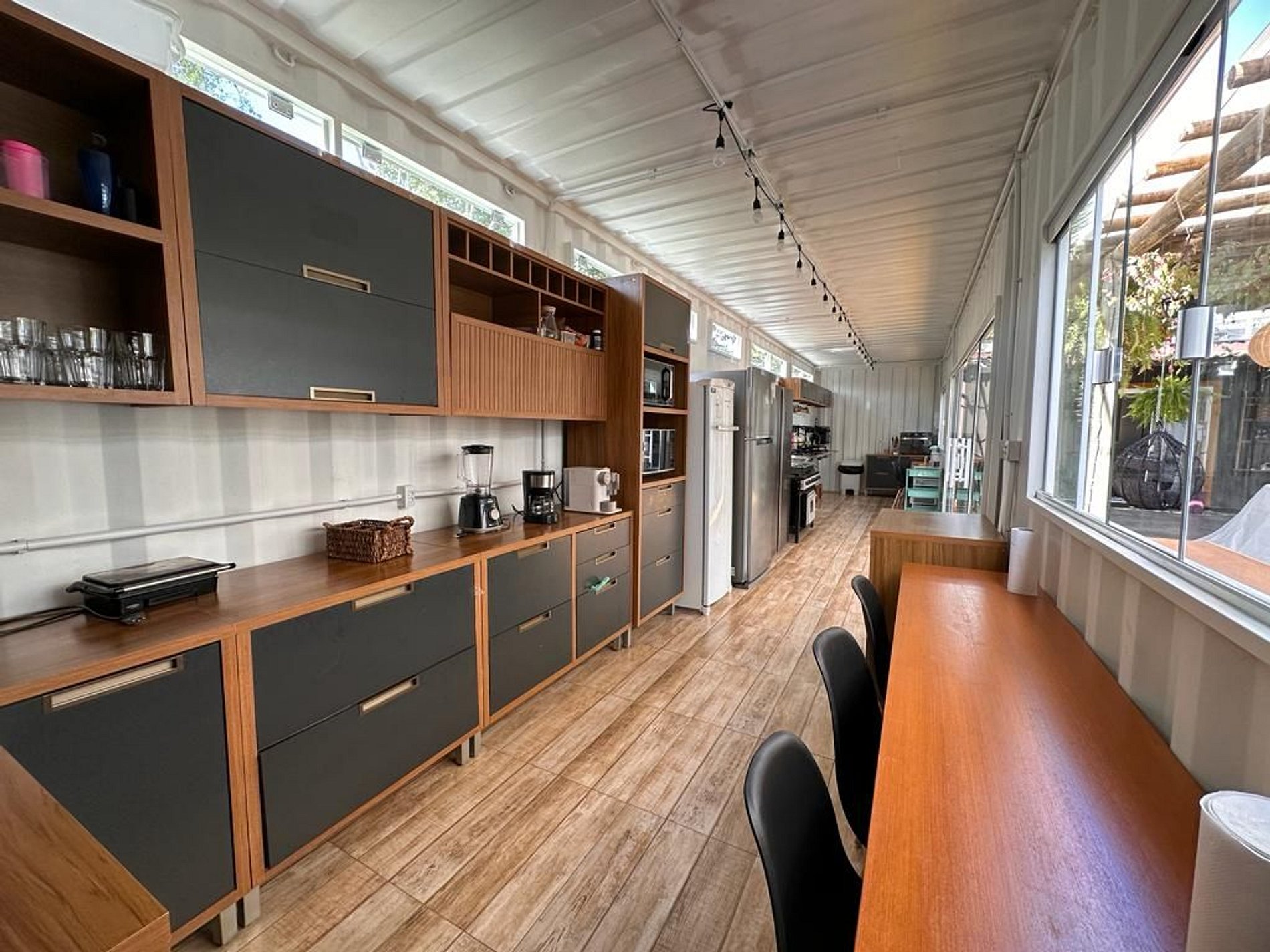 El alojamiento consta de 10 contenedores con cuatro suites y dos amplios dormitorios, dos baños externos, amplia cocina y lavandería externa, con seis baños y tiene capacidad para 34 personas en una cama king, 6 camas dobles, 6 camas individuales y 7 sofás cama.