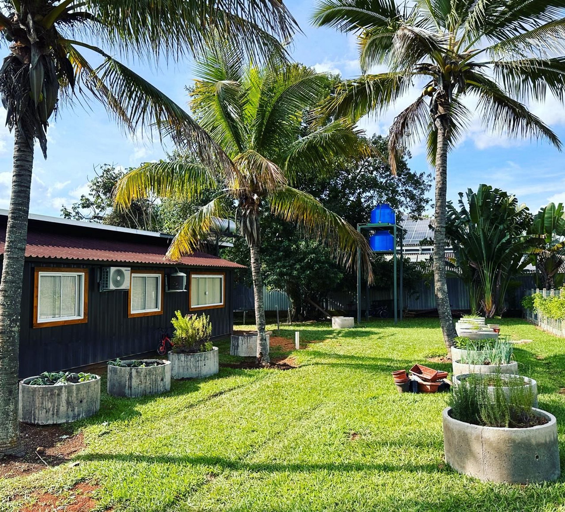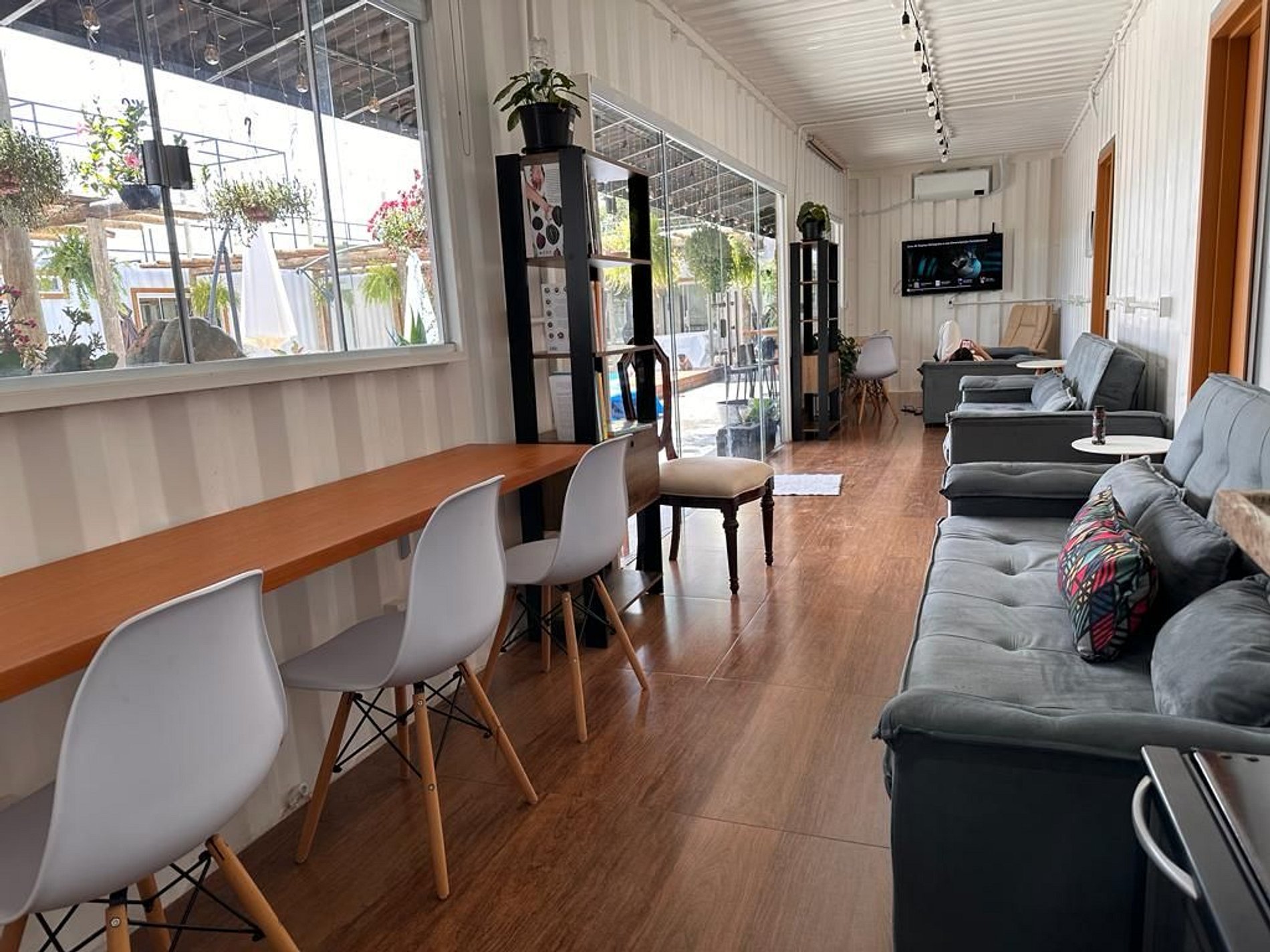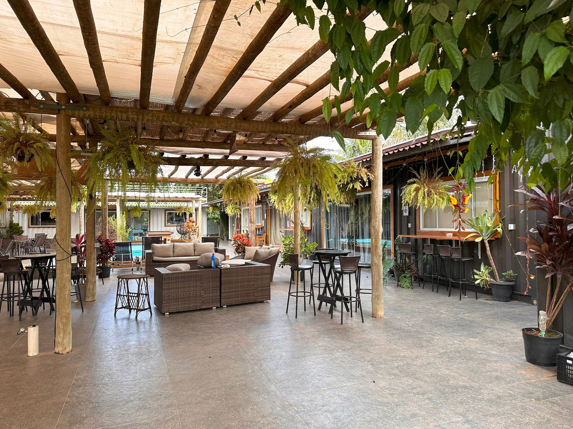El alojamiento consta de 10 contenedores con cuatro suites y dos amplios dormitorios, dos baños externos, amplia cocina y lavandería externa, con seis baños y tiene capacidad para 34 personas en una cama king, 6 camas dobles, 6 camas individuales y 7 sofás cama.