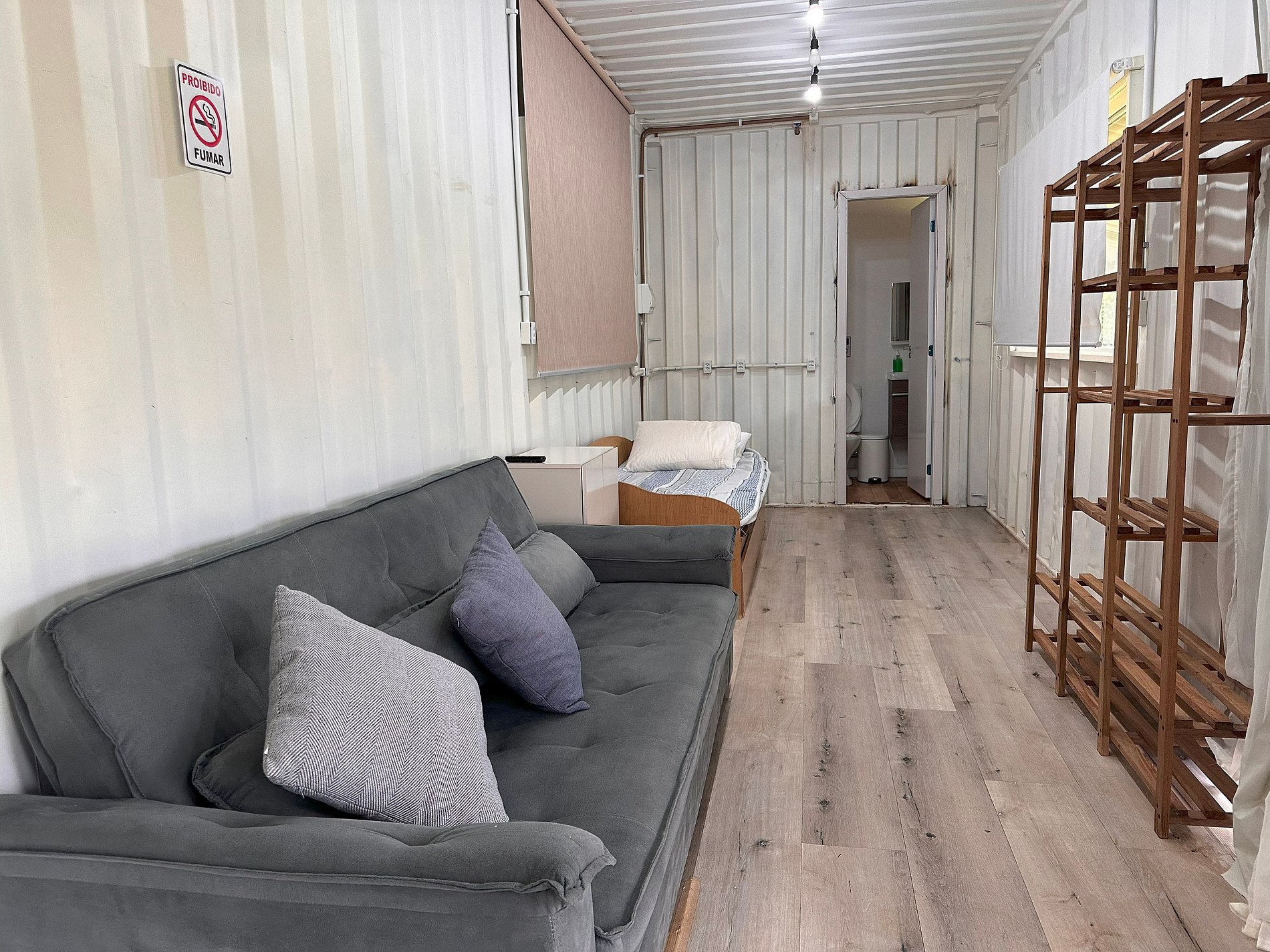 No cuenta con baño interno, aire acondicionado y TV, pero si cuenta con baño privado externo, 1 cama doble, sofá cama, 1 minibar, 1 librería y 1 escritorio.