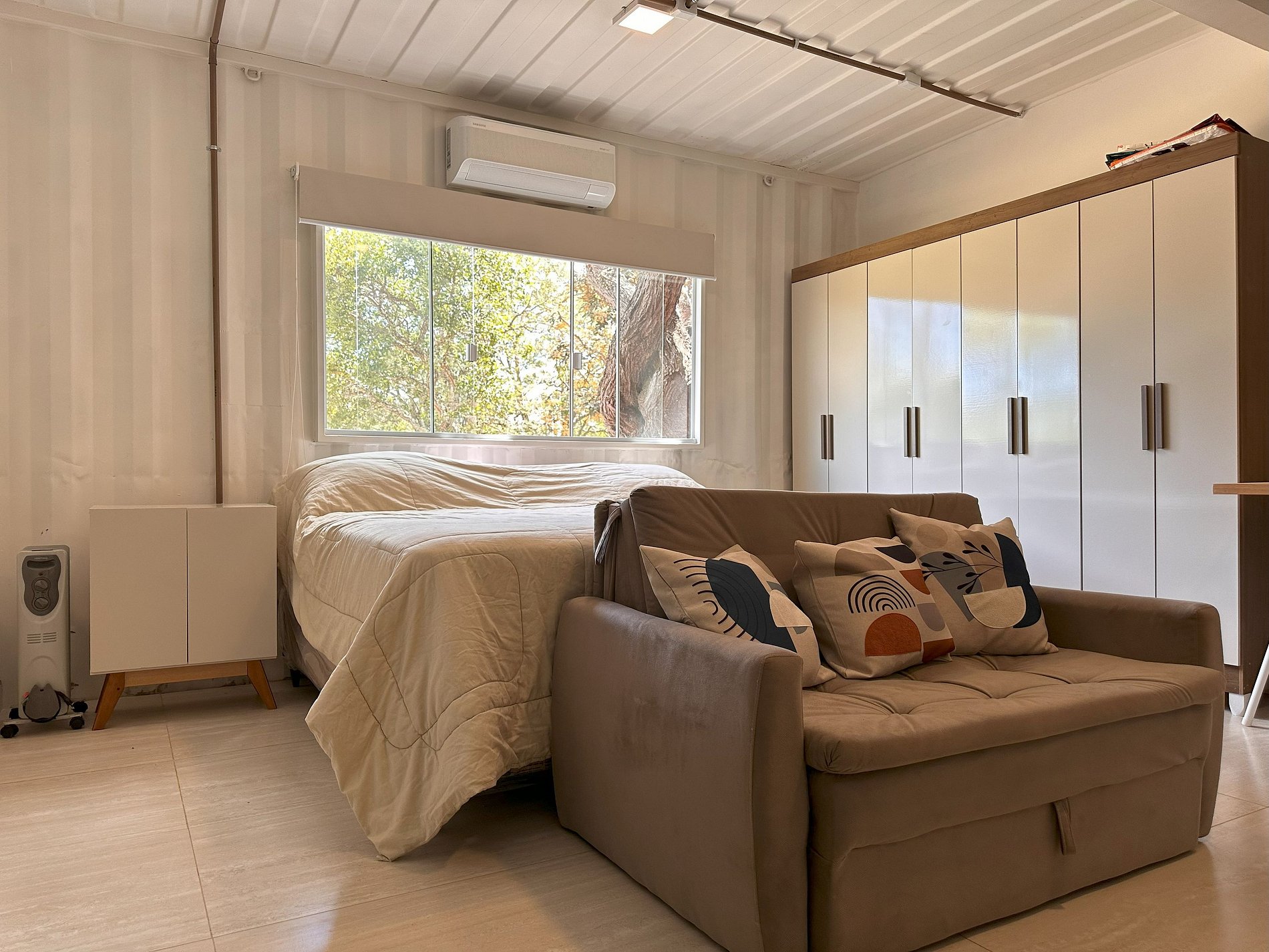 A sala possui 3 sofás-cama de casal, tv smart, banheiro e ar-condicionado.
