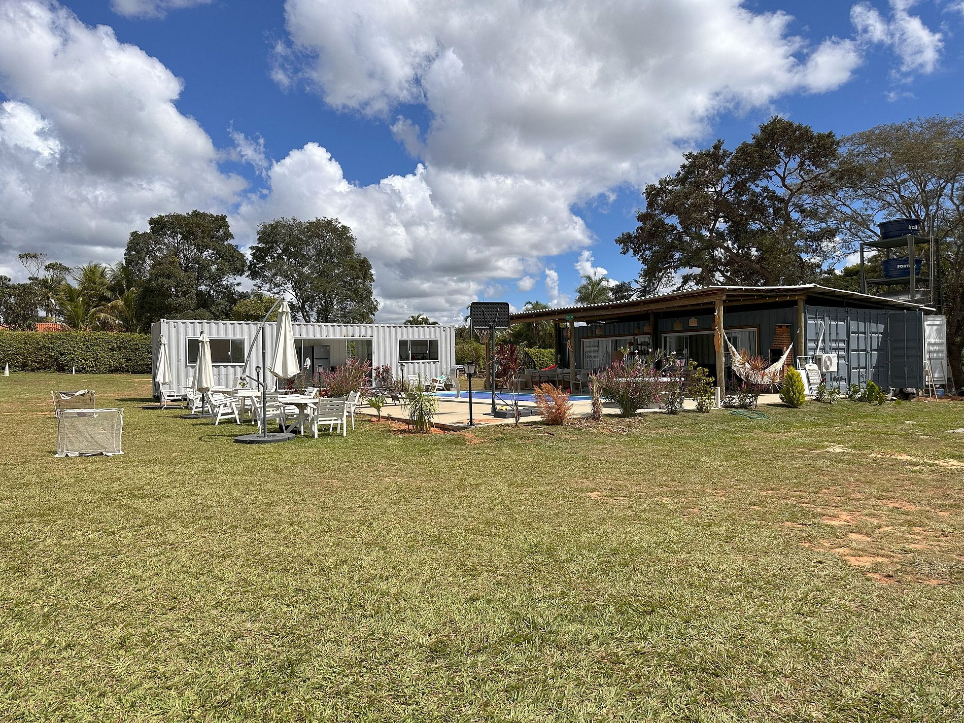 A área de lazer privativa tem piscina, churraqueira a gás e a carvão, cozinha completa, sofás, redes, mesas e cadeiras para 30 pessoas.