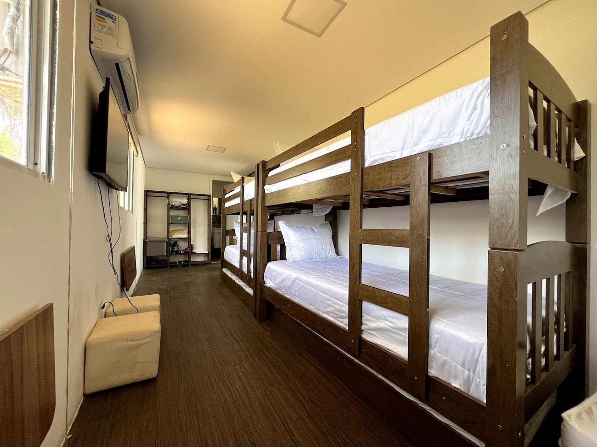 A suíte dispõem de um beliche de casal, uma mesa de trabalho, ar-condicionado, aquecedores, tv smart, filtro de água, armários de roupas, lençóis, cobertores, travesseiros e toalhas para todos.