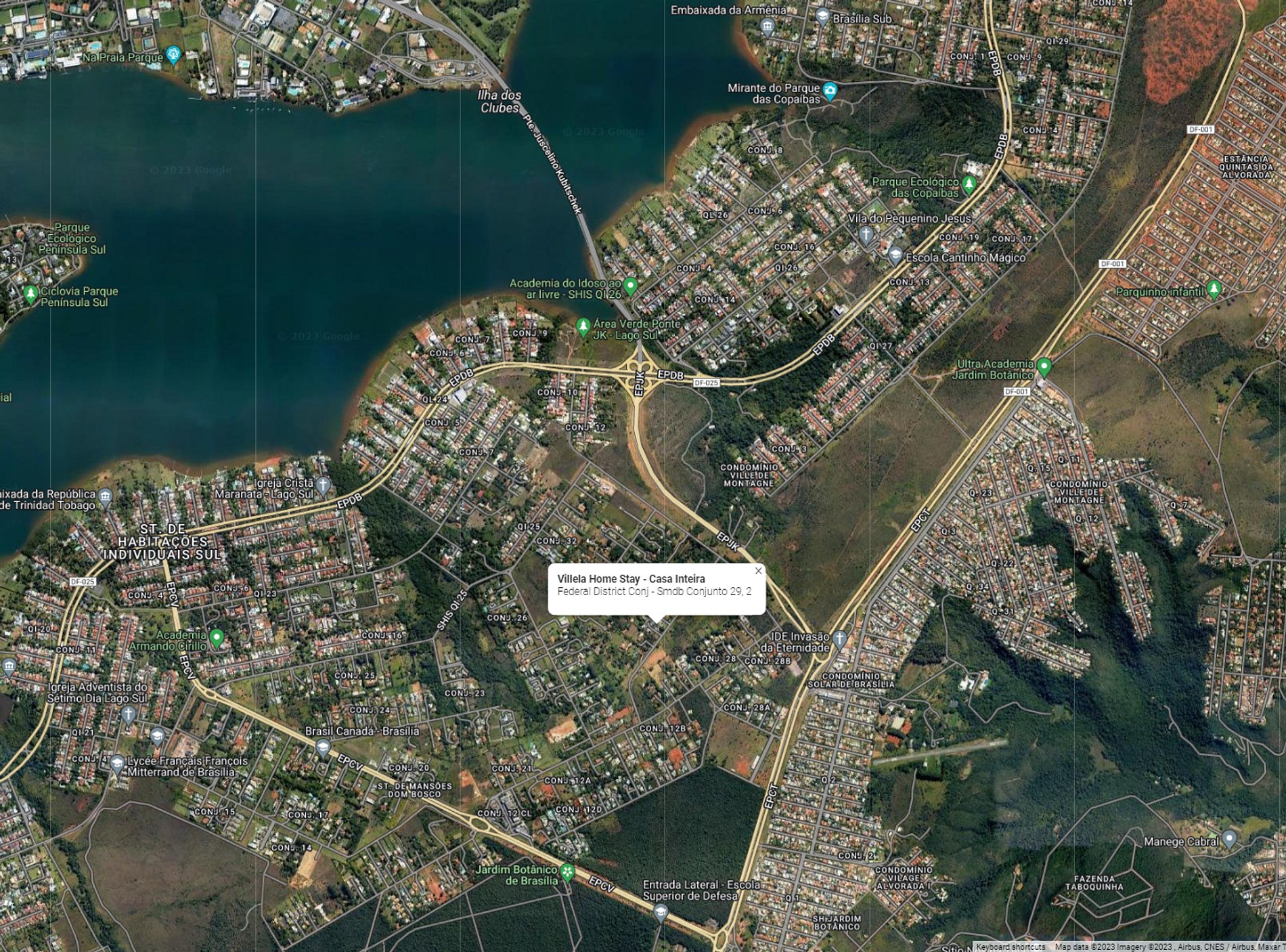 Fica próxima à Ponte JK, onde há ótimos restaurantes; tem mercados, farmácias e centros comerciais 1,5 km ; a 11 km do centro de Brasília e do Congresso Nacional.