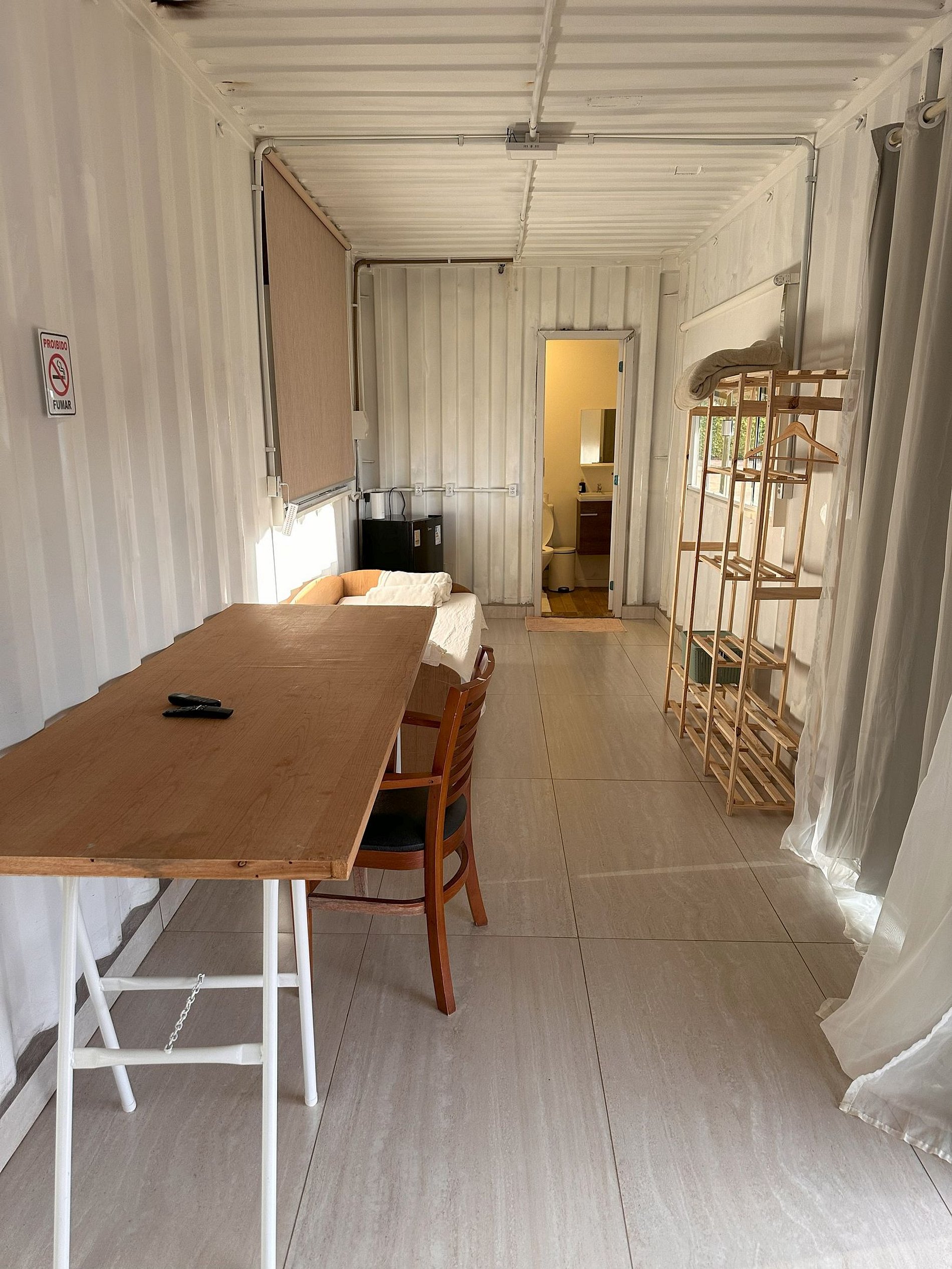 Tem banheiro interno privativo, ar-condicionado, 1 cama de casal, 1 sofá-cama, 1 beliche com cama auxiliar, tv smart, frigobar, estante de livros e mesa de trabalho.