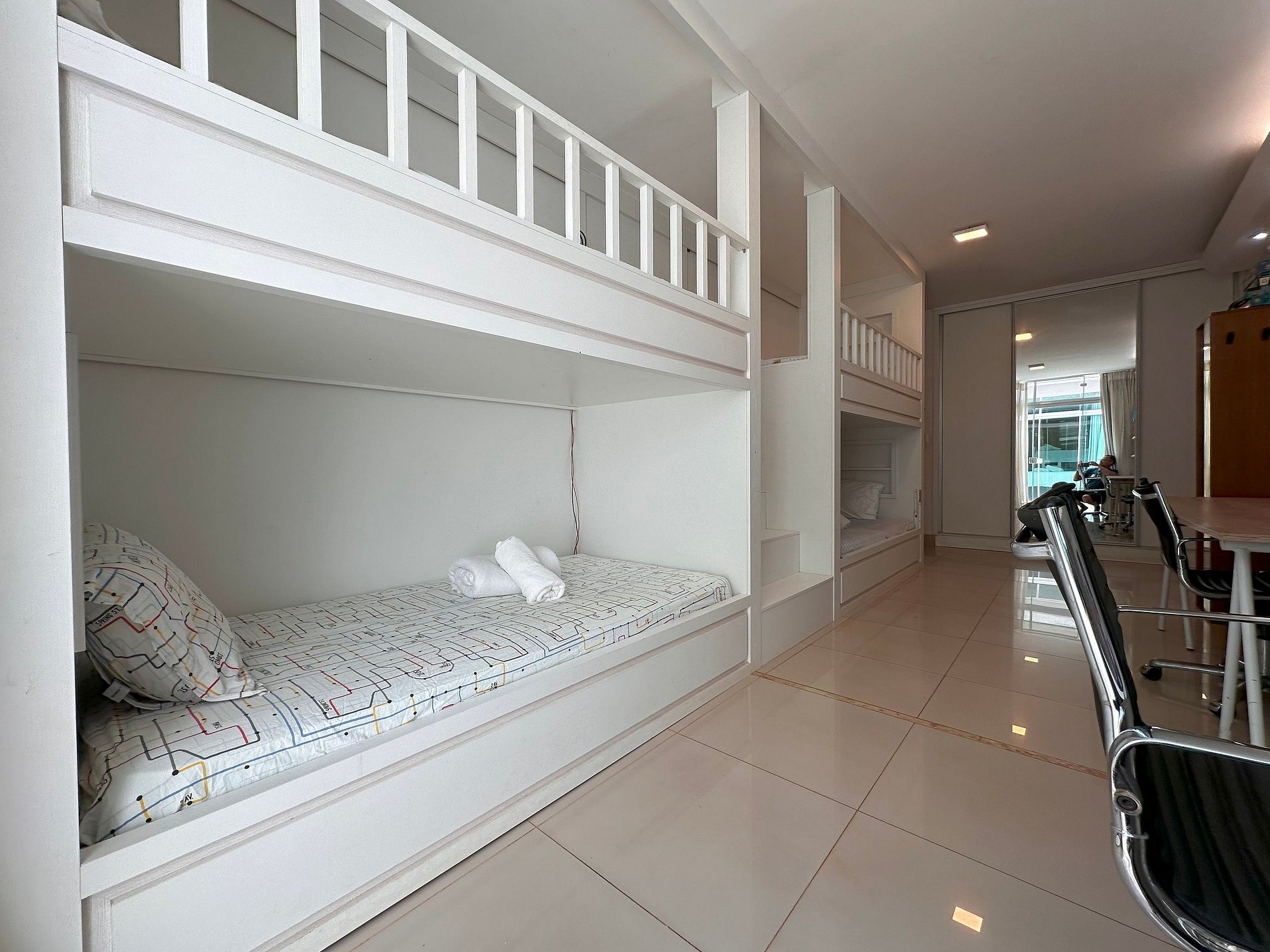 Aluguel de quarto na Casa Modernista. A Suíte do Pedro acomoda até 4 pessoas, tem um quadriliche com 4 camas solteirão, ar-condicionado, smart tv, wifi, roupa de cama e tolhas. A Casa Modernista, onde a suíte da família está situada, tem 400 m2, tem 5 suítes no total e espaço compartilhado com piscina aquecida, wifi, redário, lareira externa, lounge coberto, parquinho e pula pula para as crianças.O uso da jacuzzi e da churrasqueira é permitidio mediante reserva o pagamento das respectivas taxas.