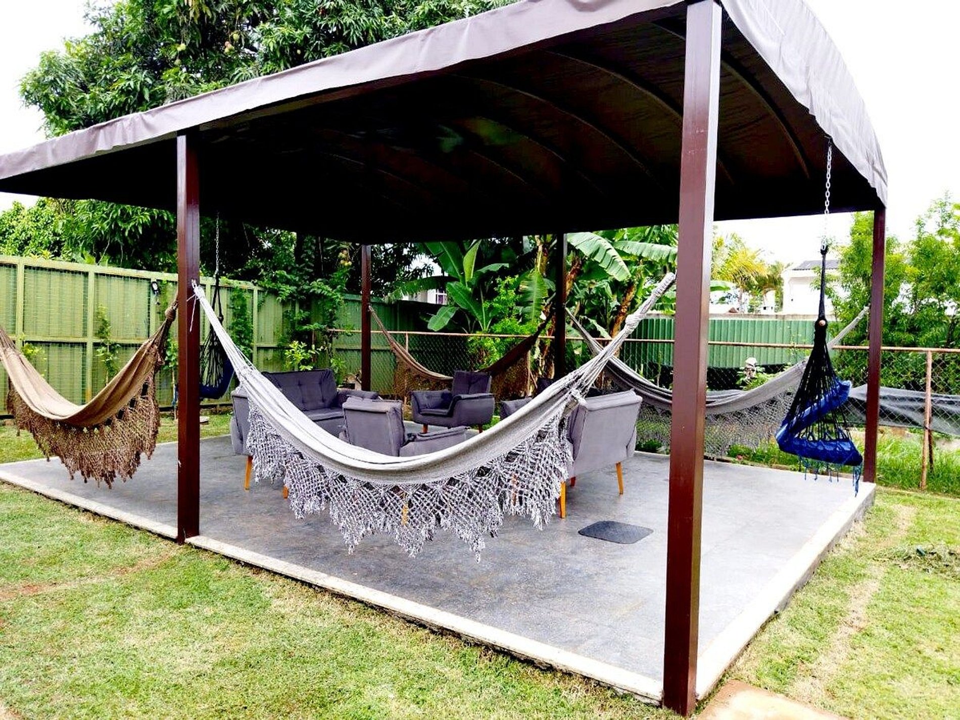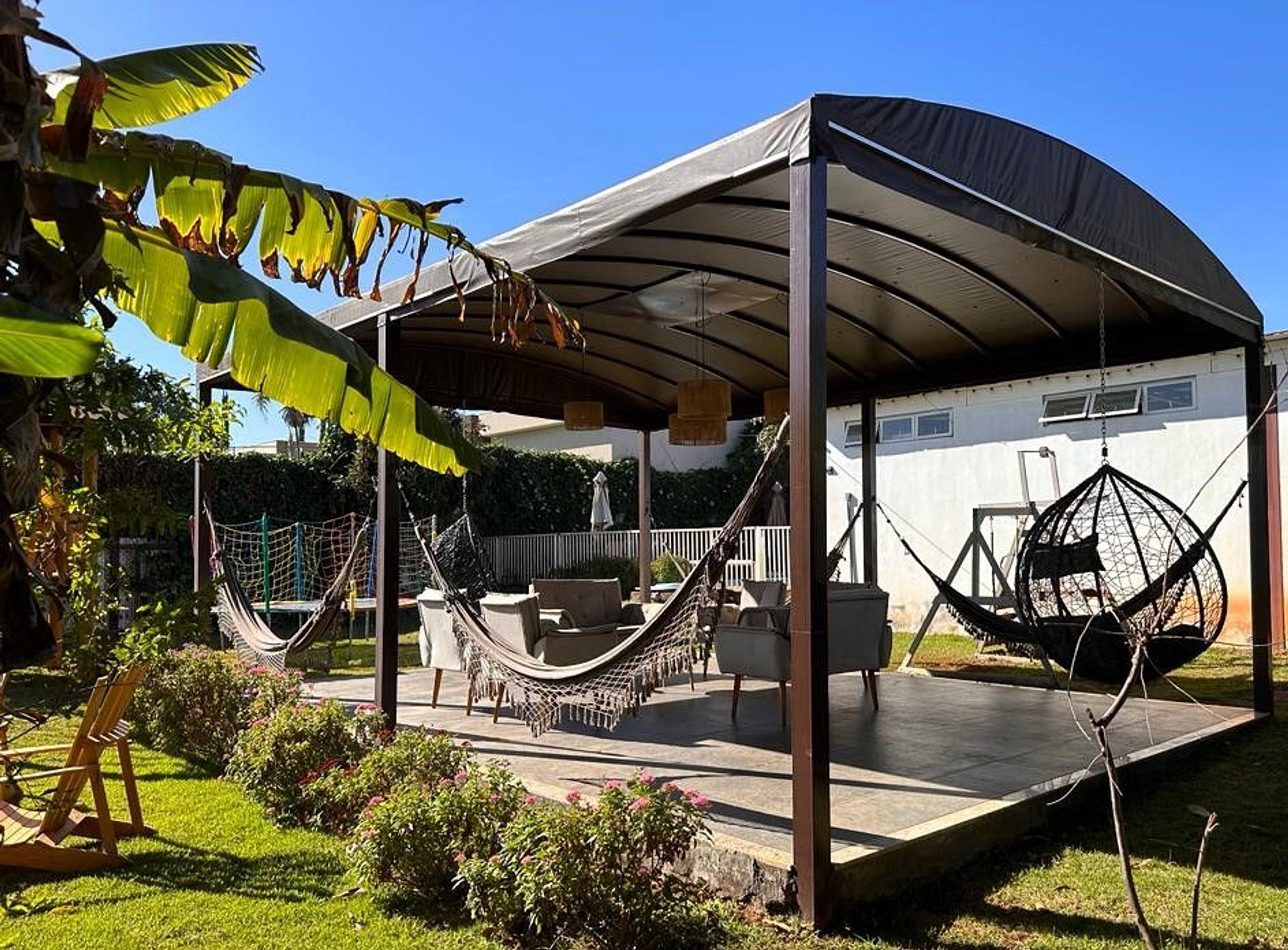 A hospedagem é adequada a crianças e animais de estimação, tem 5 suítes independentes para conforto de até quatro famílias simultaneamente.